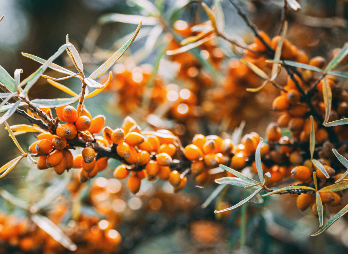 Sea buckthorn seed oil is an ultra-nourishing ingredient with regenerative and anti-aging effects that contains nearly 200 active nutrients. It is rich in fatty acids, including omegas 3, 6, and 9, vitamins A, C, D, E, F, K, P, and B complex vitamins, phytosterols, carotenoids, and strong antioxidants. Furthermore, it contains approximately 36 types of flavonoids, 11 minerals, and 18 amino acids. This versatile seed oil fights free radicals, improves skin elasticity, diminishes the appearance of wrinkles, and strengthens the skin's surface, helping to limit excessive water loss. It also contains soothing properties that improve signs of sensitivity.